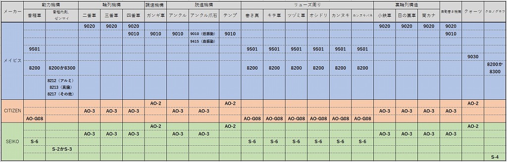 オイル種類:9020(輪列)、9010(調速脱進機)、9415(アンクル高振動)、9501(リューズ周り)、9030(クォーツ)、8200/8300(香箱、香箱内、リューズ周り、クロノグラフ)、8212/8213/8217(ゼンマイ)